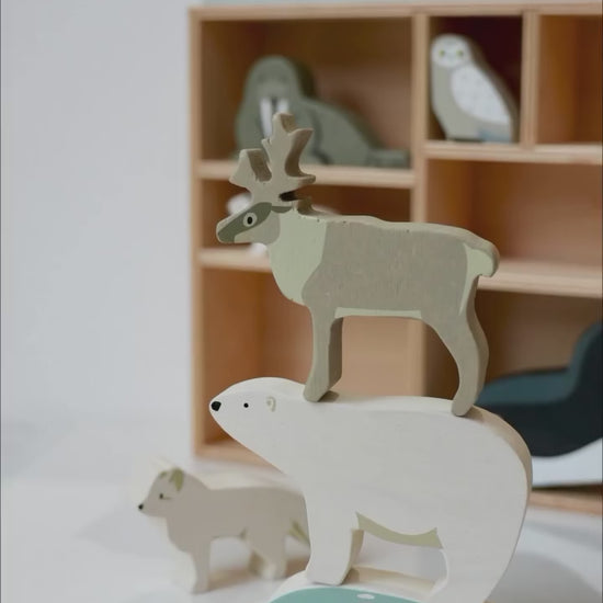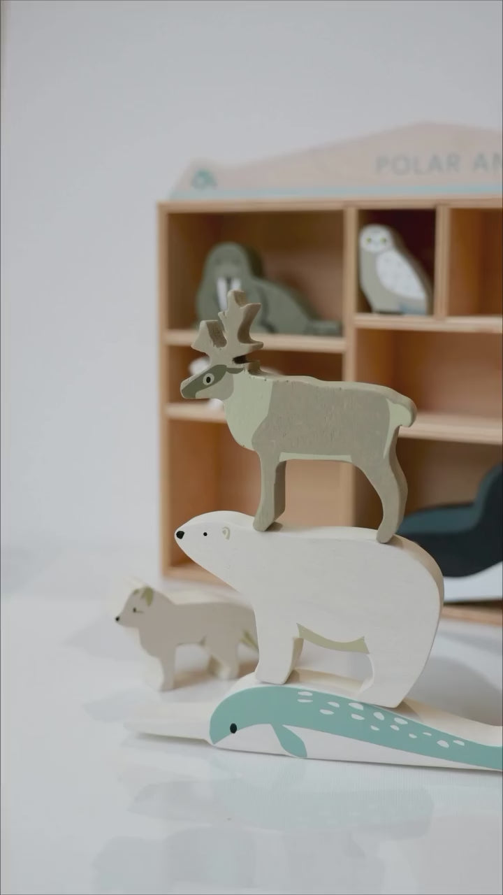 Ismerd meg a Föld jeges vidékeinek veszélyeztetett állatait! Ez a tömörfából készült, gyönyörűen festett játékkészlet 10 sarkvidéki állatfigurát tartalmaz: kardszárnyú delfin, narvál, hónyúl, sarki róka, császárpingvin, bagoly, hermelin, rozmár, jávorszarvas és természetesen a jegesmedve is megtalálható benne. A praktikus polcos tárolóban szépen rendszerezve érkezik, így a játék és a rendrakás is élmény lesz.